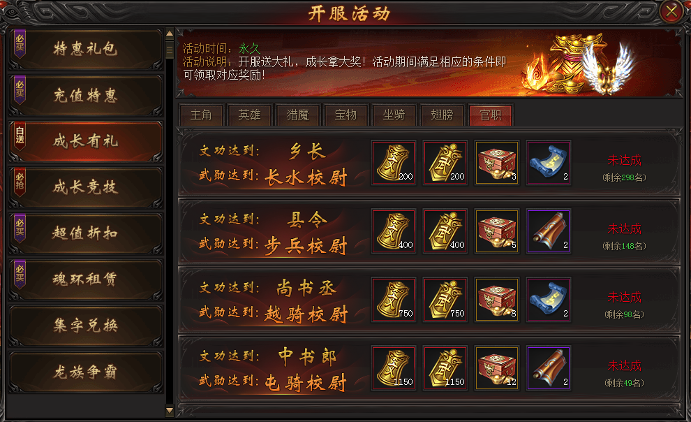 到達對應的官職可以獲得對應的成長有禮獎勵