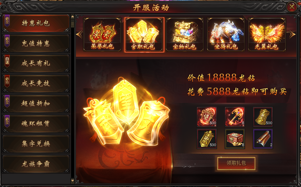 特惠禮包有個官職禮包也可以購買,里面有聲望(升級VIP需要)、秘寶鑰匙、文功令、武勛令、元寶、離火雙倍卷軸