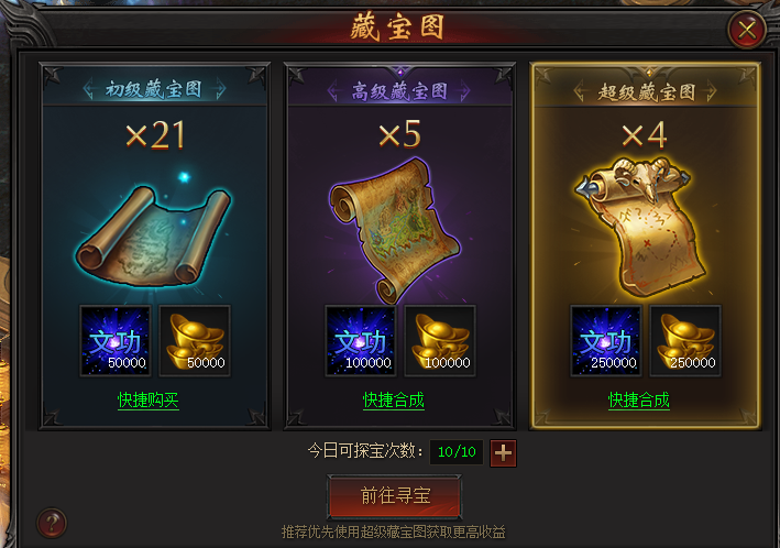 可以通過日常任務中的探寶活動完成10次探寶獲得,越高級的藏寶圖獎勵就越好,給的文功也就越多