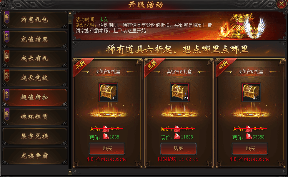 開服第四天的超值折扣是官職禮盒,里面內容是文功值和武勛值,有競技實力且想沖競技榜的可以購買。