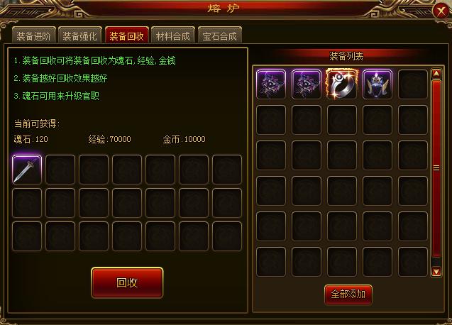 裝備回收是本游戲一大特色,隨身回收只要點(diǎn)開熔爐就可以操作。把不需要的裝備回收成魂石、經(jīng)驗(yàn)、金錢,不管那一種對(duì)于你都是很有用的東西,把沒用的東西換成有用的東西,何樂不為呢。