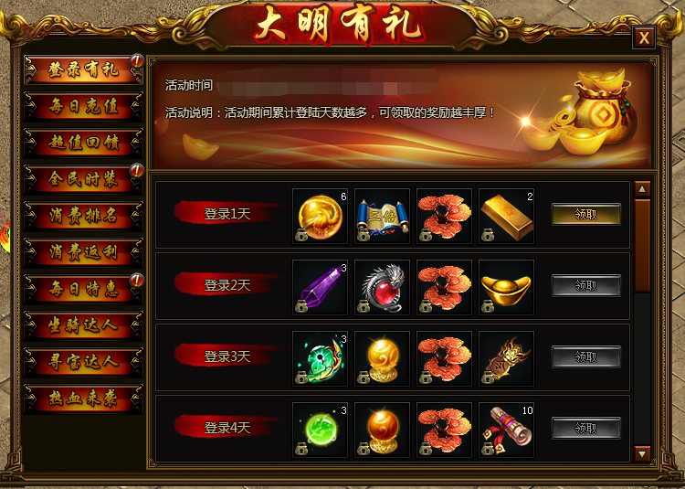 【活動說明】每天登錄可領取豐厚獎勵,登錄天數越多領的越豐厚