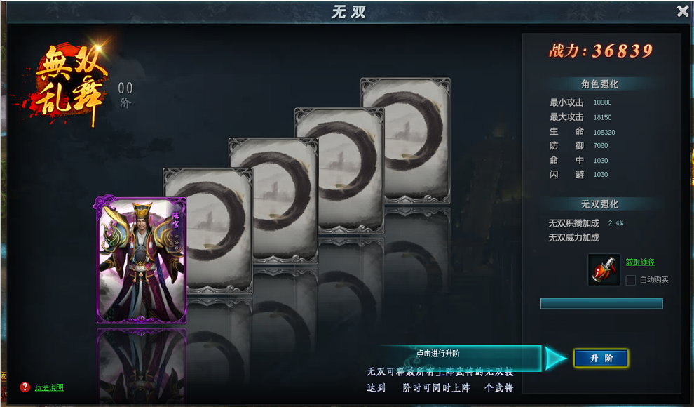 2) 階數越高可上陣的武將越多、殺怪獲得的無雙值越多、無雙威力越大